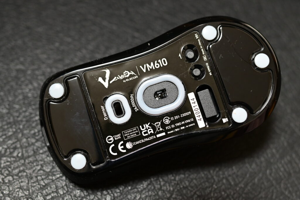 で、ここでこのVM610の特徴なんですけど、24000DPIの高精度ゲーミングマウスで、机からマウスまでのセンサーの高さを調整できる機能がある。これ、なんでかっていうと、使ってるマウスパッドに合わせて感度を調整するためらしい。あと超軽量の54gでワイヤレスも可能。