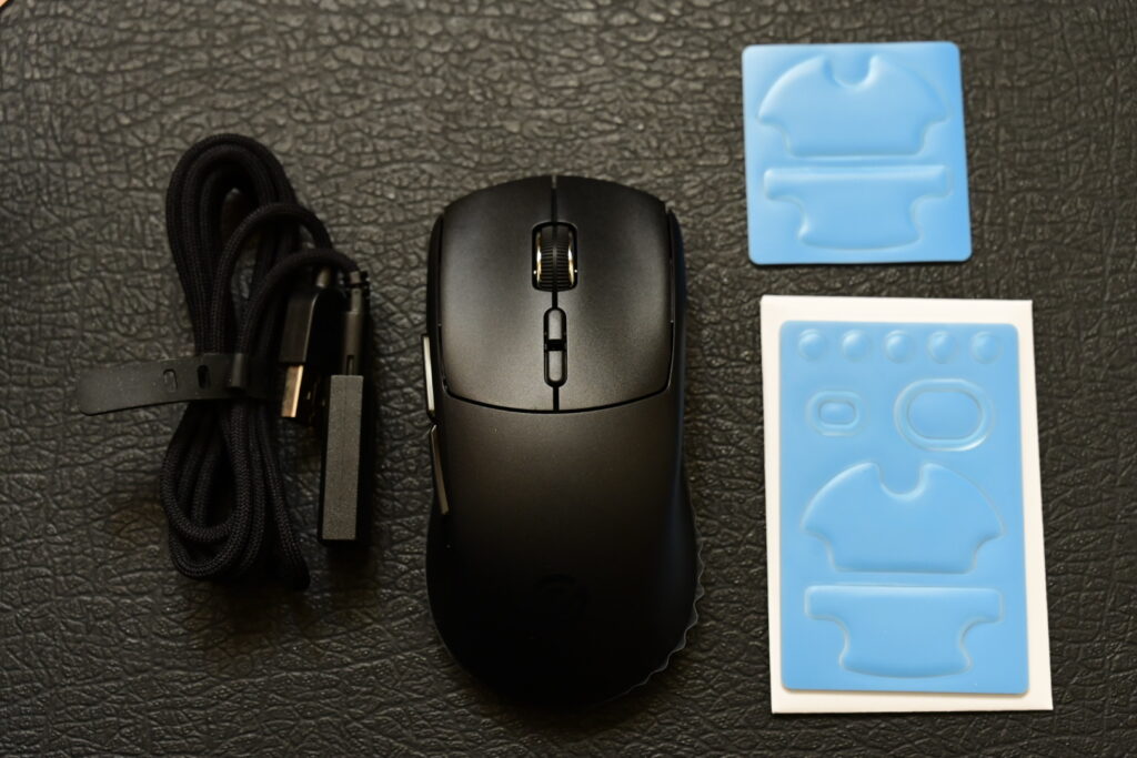 ケースを開けると一緒に入っていたのは、マウスの裏に貼る「滑り用シート」とPCとつなぐための「ケーブル」になります。