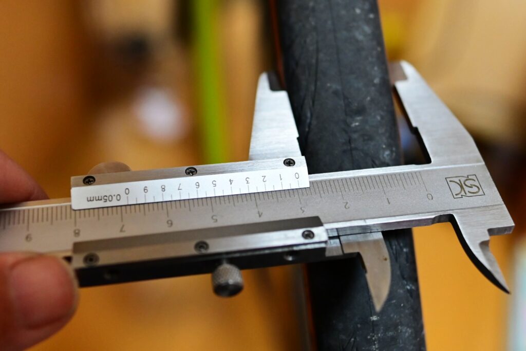 実測幅は29.5mmほど。これはMICHELIN POWER CUP TLRの25Cと同等です。新ETRTOで28cはC19リム換算となるので、(詳しくはこちら)内幅23mmだと30mm弱が期待されます。29.5mmは非常に妥当な値で、GP5000STRは新ETRTO規格に沿ったタイヤということが分かります。