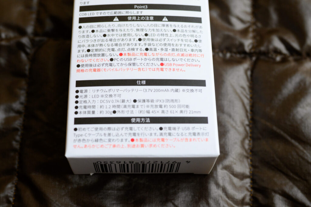 バッテリーは200mAh。IPX3の防雨形で多少の雨なら大丈夫なのもアウトドアでの使用に良い。