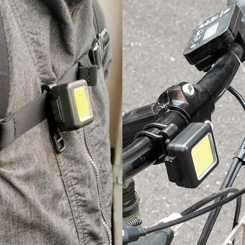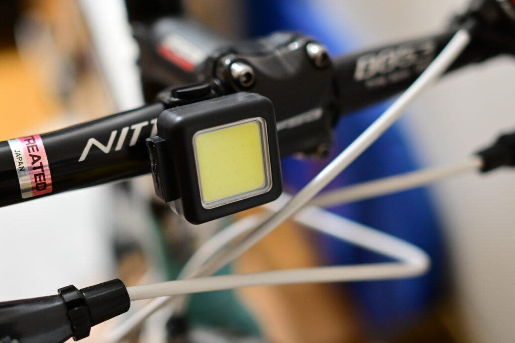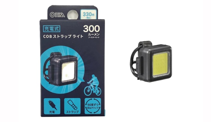 自転車に取り付けられるCOBストラップライト、300ルーメンなら45分、250ルーメンで1.5時間、120ルーメンで3.5時間もつ。実測26g